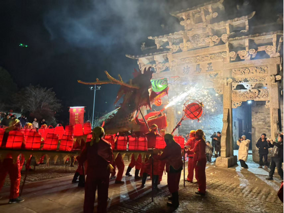 在舞龙表演中,表演者们身穿彩色的道具服装,配合鼓乐和热烈的音乐声,灵活的动作模拟龙的游动、跳跃和翻滚等。通过舞龙活动,祈求风调雨顺、五谷丰登。现场热烈的掌声和欢呼声交织成一片,伴随着锣鼓声和爆竹声,整个乡村洋溢着喜庆与祥和的气氛。这场盛宴不仅丰富了村民的节日生活,也让传统文化在新时代大放异彩。