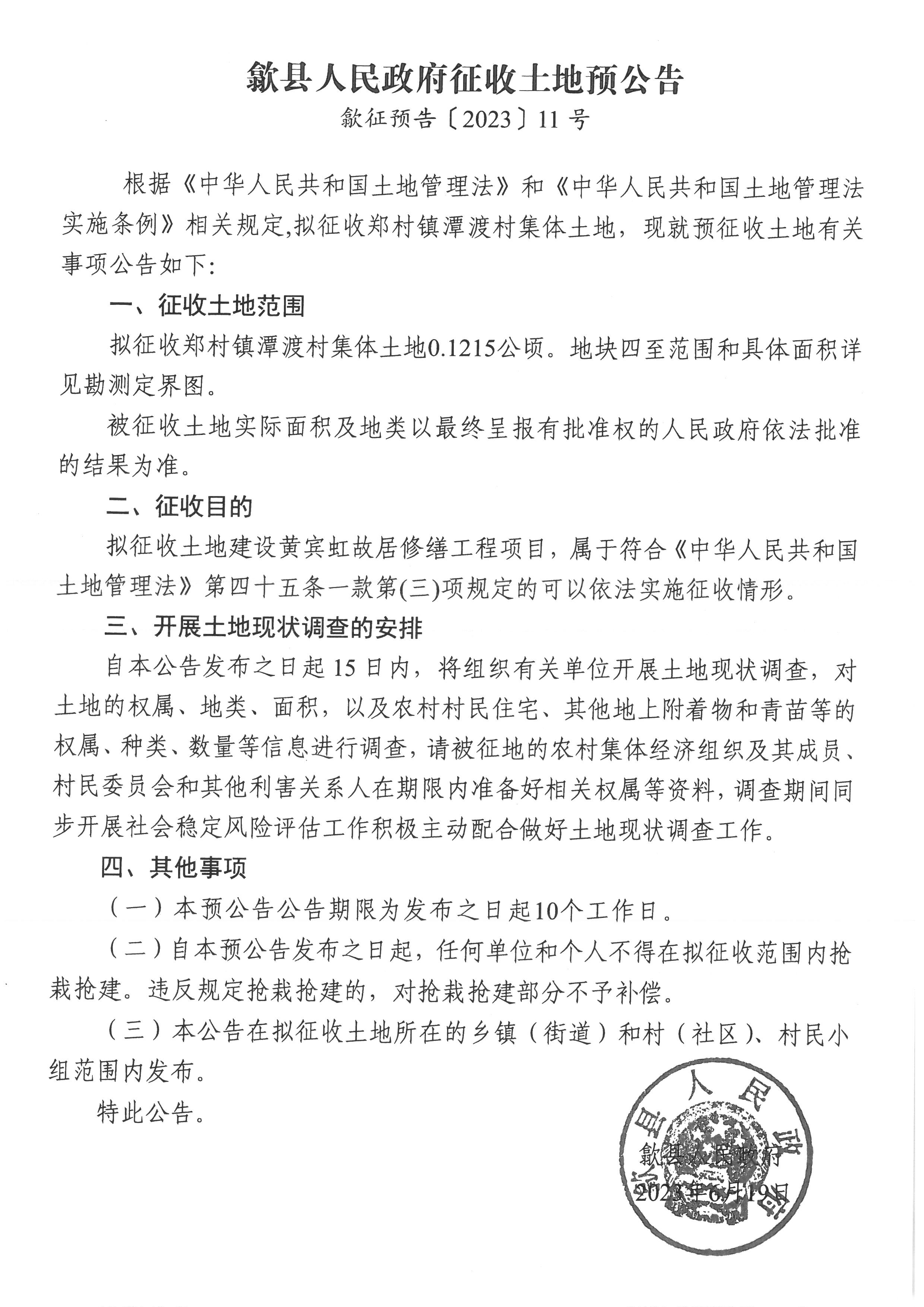 歙县人民政府征收土地预公告 (歙征预告〔2023〕11号)