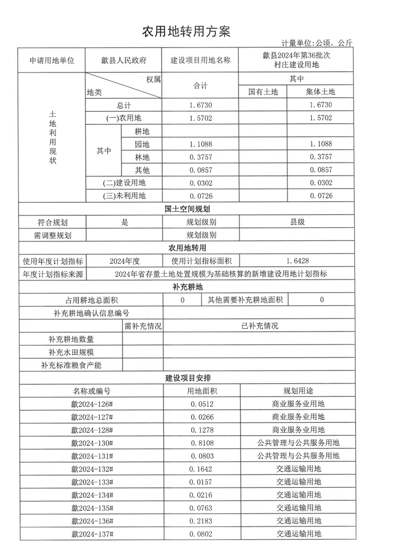 歙县2024年第36批次村庄建设用的农用地转用方案