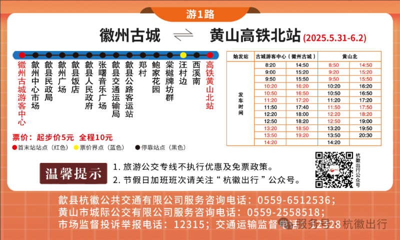 如需咨询,可拨打服务热线:黄山市城际公交有限公司:0559-2558518;歙县杭徽公共交通有限公司:0559-6512536。