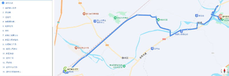 始发站:高铁黄山北站-西溪南-汪村边-棠樾牌坊群-鲍家花园-郑村-歙县公路客运站-歙县交通运输局-张曙音乐广场-歙县人民政府-歙县饭店-歙州广场-民政局-歙州中心市场-终点站:徽州古城游客中心