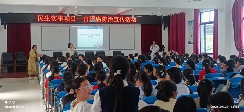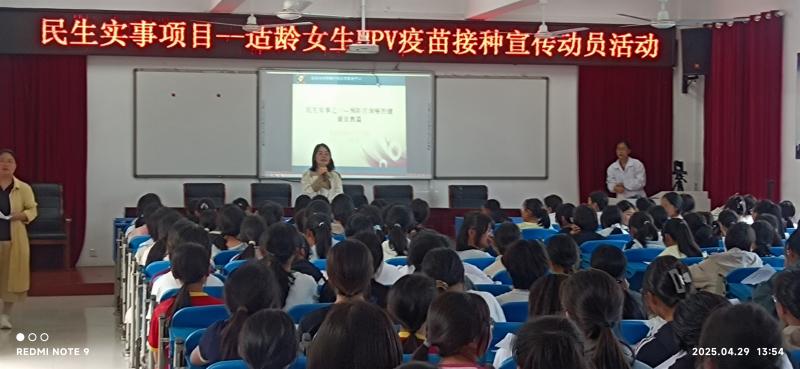 近日,根据省市县卫生健康工作安排,将为全省适龄女生免费接种宫颈癌疫苗,落实三十项民生实事之一。为此王村中心卫生院根据县卫生健康委会议要求,结合实际,于4月29日下午赴王村中心学校及横关学校开展“9-14岁适龄女生免费接种国产二价人乳头瘤病毒疫苗(HPV疫苗)”和“宫颈癌科普知识宣传”活动,吸引400余名师生参加聆听。