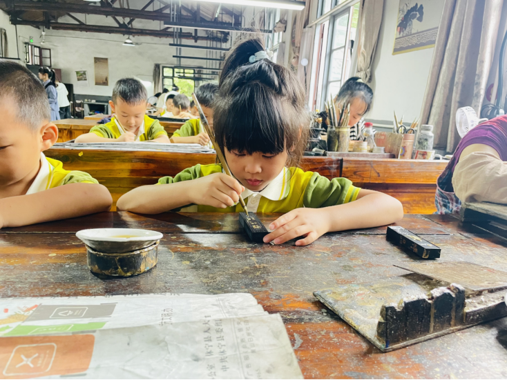 描金环节最是动人。孩子们手握毛笔,在老师的指导下,在专属的小墨条上小心翼翼地勾勒。原本叽叽喳喳的孩童忽然屏息凝神,放慢速度、专注笔尖。这看似简单的动作,实则是耐心的沉淀、细心的考究与恒心的坚守。“沉心静气”“精益求精”的工匠精神,已悄然融入孩子们的成长历程。教育的“描金笔”,在此刻,不仅勾勒出知识的轮廓,更筑牢了孩子们的精神底色。