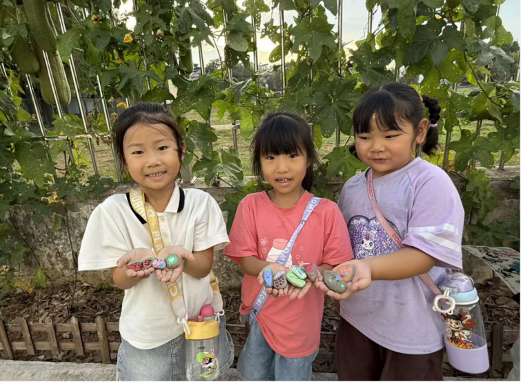 活动中,原本沉默的石头成为了孩子们最痴迷的“画布”。他们用指尖触摸石头的轮廓与纹理,感受其不规则的形状和凹凸的触感。这份来自大自然的独特体验,极大地激发了幼儿的创作灵感。在教师的引导下,孩子们依据石头的天然形态进行构思,让粗粝的顽石“变身为”可爱的动物、斑斓的星球,甚至是自己天马行空的梦境,被赋予了全新的艺术生命。