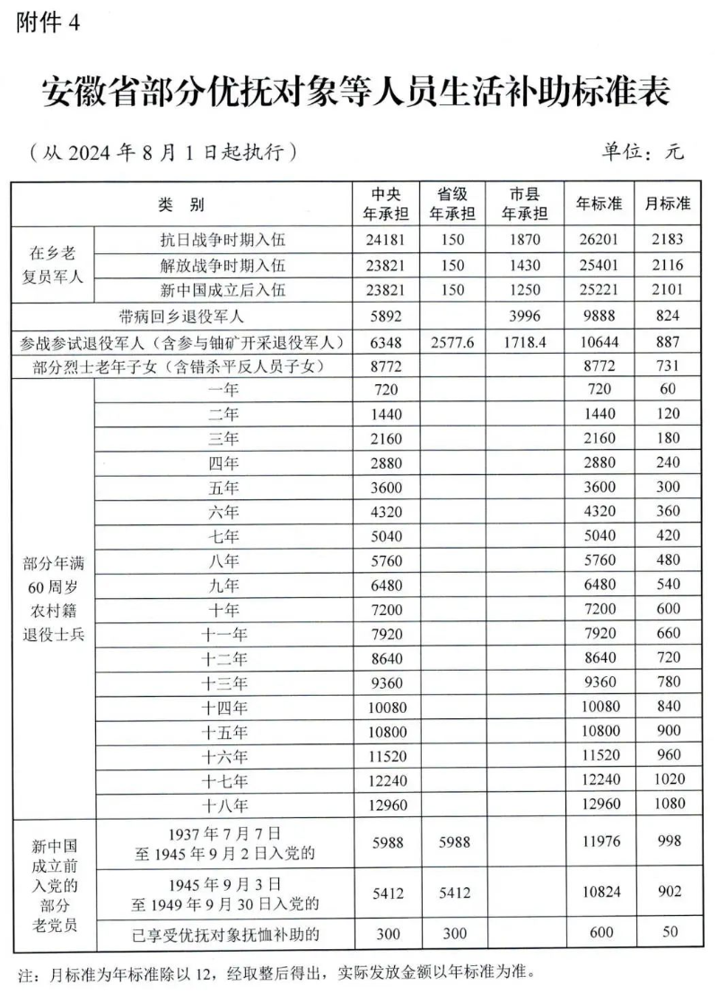 【政策标准】安徽省退役军人事务厅、财政厅关于调整部分优抚对象等人员抚恤和生活补助标准的通知