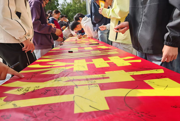 随后,同学们有序来到印有活动主题的巨型横幅前,手持签字笔郑重签下自己的姓名。一笔一划间,承载着同学们远离不良行为、追求健康成长的坚定决心;整齐排列的签名,构成了校园里一道充满正能量的风景线。不少同学在签名后相互交流感悟,纷纷表示将从自身做起,规范言行举止,同时主动提醒身边同学,共同守护纯净的校园环境。
