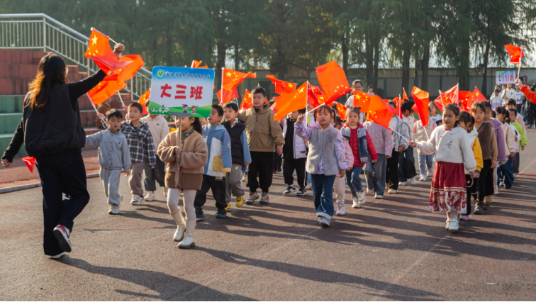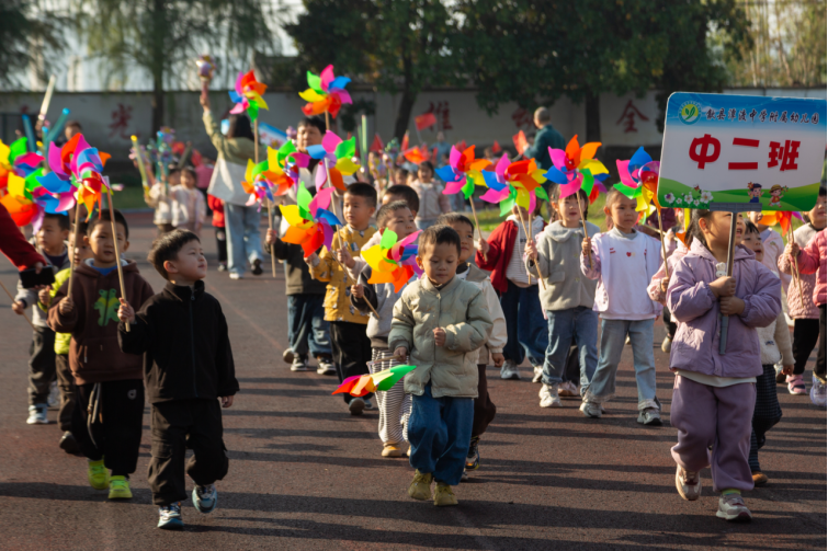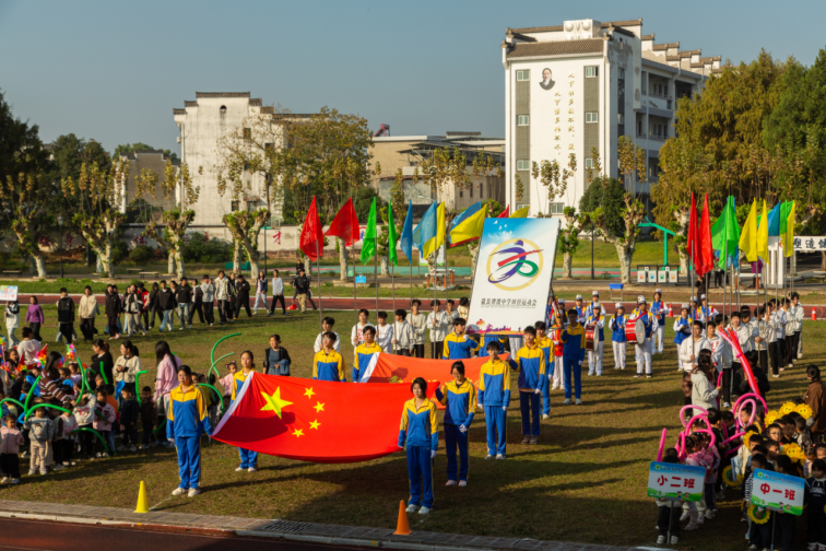伴随着激昂的《运动员进行曲》,开幕式正式拉开帷幕。仪仗队迈着铿锵步伐率先入场,鲜红的国旗与校旗在阳光下格外耀眼。紧随其后的附属幼儿园方阵成为全场焦点:小班萌娃手举迷你红旗,稚嫩的脸庞满是庄重;中班孩子挥舞五彩风车,转动的风车扬起阵阵童趣;大班学子手持闪亮彩环,齐声喊出“快乐运动,健康成长”的口号,萌态十足的表现引得全场掌声不断。