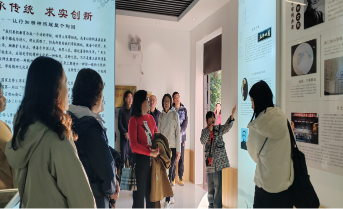 一走进校园,大家就被学校错落有致的布局吸引,兴高采烈地在行知塑像前留影。接着,跟随红领巾小讲解员的脚步参观了校园,行知路上的陶行知经典教育故事、行知堂的十六字行知精神、gan园内的素娥亭和墙上的陶行知歌曲、生活·实践教育展厅里的学生作品、走廊及楼道文化等,无不吸引来宾们热切的目光。