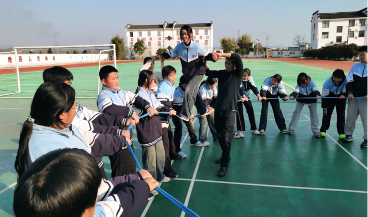 在初中部,刘晓燕老师精心策划了一场以“户外拓展启心智•导师陪伴筑心桥”为主题的拓展活动。“搭肩兔子舞”拉开了活动的序幕。同学们或轻盈踢腿,或欢快跳跃,尽情释放着身体的活力与能量,在轻松愉悦的氛围中充分感受着活动的乐趣。接着,“心有千千结”开始,同学们迅速行动,灵活运用钻、绕、跨、蹲等多种动作,巧妙变换队形。各组之间展开了激烈比拼,现场气氛紧张热烈。随后,“动力圈”环节将活动推向高潮。队员们紧密协作,共同挑战“波浪起伏”“波涛汹涌”和“走钢丝”三个极具难度的环节。大家相互鼓励、相互支持,不断克服困难,极大地提升了团队的默契度和凝聚力。活动结束后,同学们还分享了各自的感受。大家畅所欲言,纷纷表达对活动的喜爱以及对团队协作重要性的深刻认识。