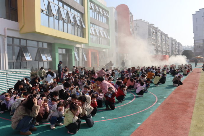 警报响起,演练启动。各班教师迅速组织幼儿用湿毛巾捂住口鼻,弯腰低姿,沿预定疏散路线快速、有序撤离至操场安全区域,全园270名幼儿,仅3分钟就完成了疏散工作。