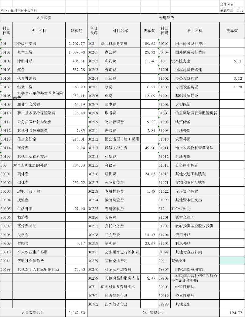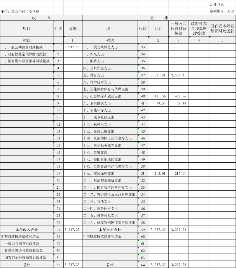 注:本表反映单位本年度政府性基金预算财政拨款收入、支出及结转和结余情况。 说明:歙县王村中心学校没有政府性基金预算收入,也没有使用政府性基金预算安排的支出,故本表无数据。 |