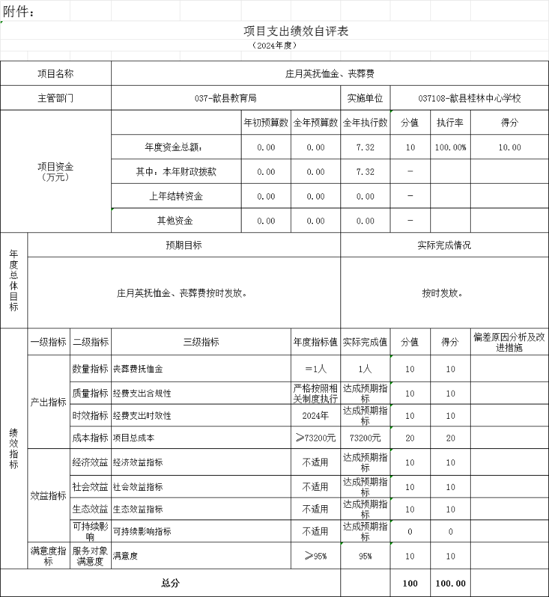 丧葬费和抚恤金(庄月英)项目绩效自评综述:根据年初设定的绩效目标,项目绩效自评得分为100分。全年预算数为7.32万元,执行数为7.32万元,完成预算的100%。项目绩效目标完成情况:一是项目成本按照年初的预算进行,没有超出预算;二是项目实施是按照计划完成,没有延误执行进度;三是各项绩效目标均已完成,并取得预期效果。