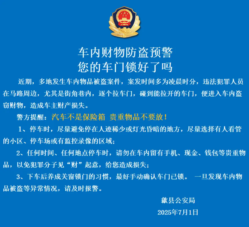 【社会安全类预警信息】车内财物防盗预警