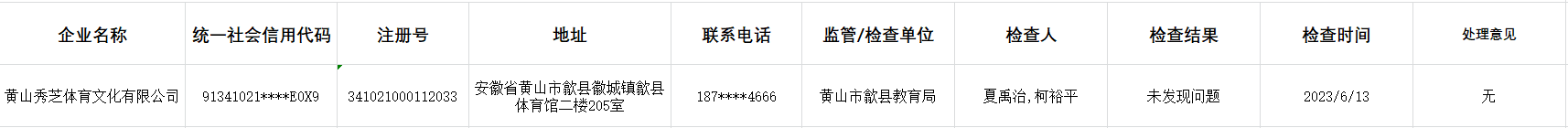 【双随机、一公开】黄山市歙县2023年度全县校外培训机构部门联合抽查(体育类)结果汇总表