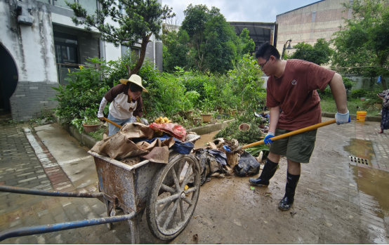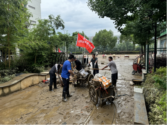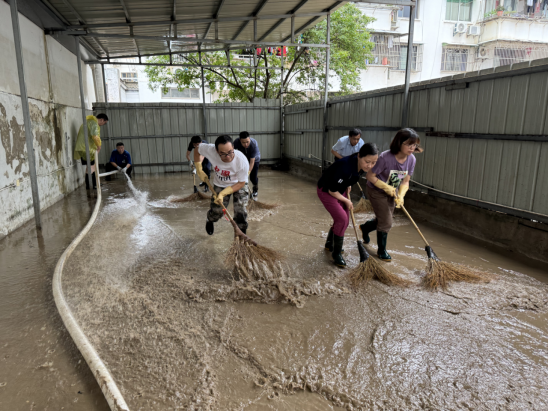 洪水退一寸,清淤进一步。6月21日-22日,歙县自然资源和规划局30余名党员志愿者紧急集合,分别走进包保小区徽州御苑、国土局宿舍小区,在扫水车、拖拉机、挖机、小推车等机械协助下,对小区内部进行全覆盖清淤。沿河受灾商铺店主、部分楼栋一层被淹房屋居民也积极主动行动,整理受损物品、冲洗房屋地面,共同为尽快恢复生产生活秩序出力。