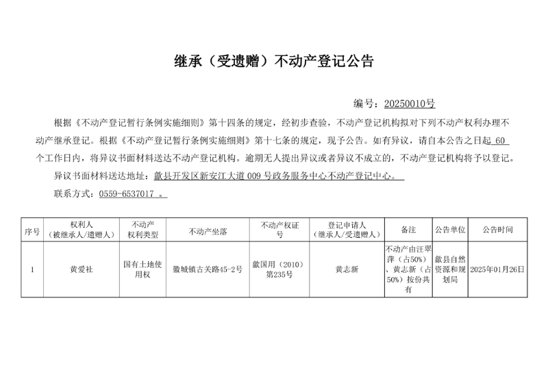 继承(受遗赠)不动产登记公告——黄志新
