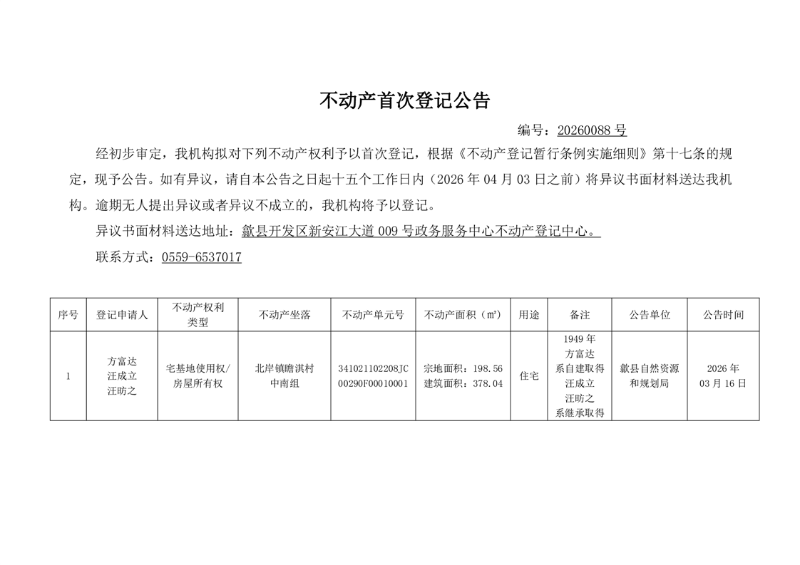 不动产首次登记公告(方富达、汪成立、汪昉之)