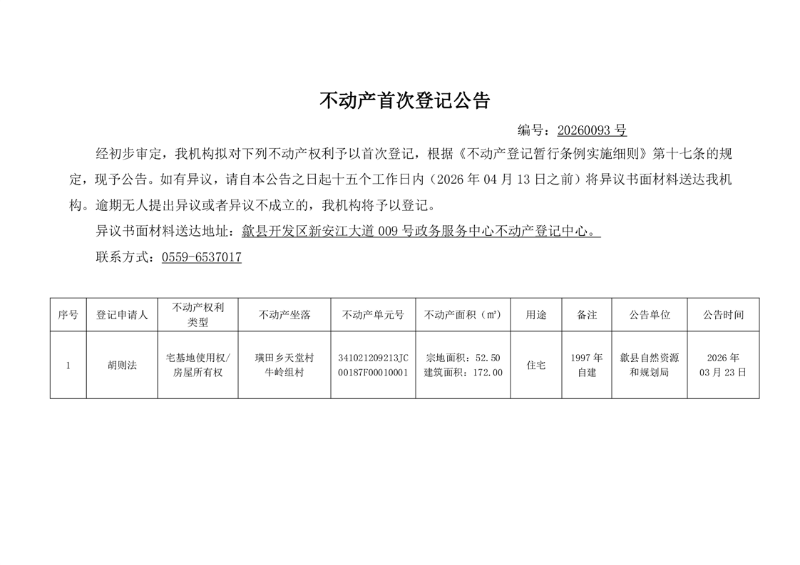 不动产首次登记公告(胡则法)