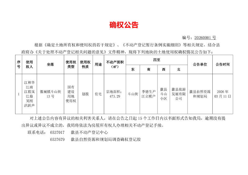 确权公告(江林华、江南、江筱岚、江鼎、吴刚、洪跃声)