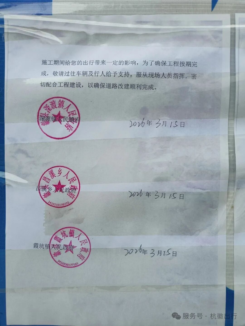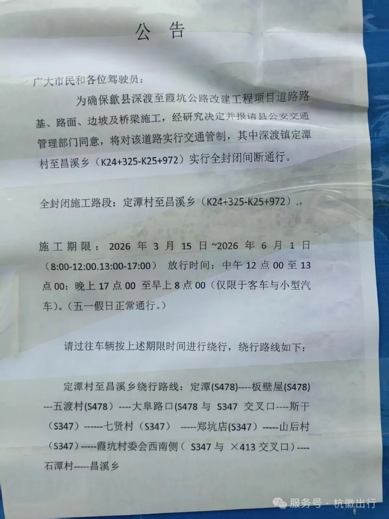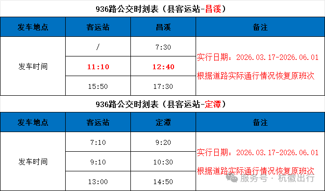 因歙县深渡至霞坑公路改建工程实施交通管制,定潭村至昌溪乡段(K24+325-K25+972)实行全封闭间断通行,施工期为2026年03月15日至2026年6月1日,每日8:00-12:00、13:00-17:00禁止通行。受此影响,936路公交车在此期间将临时调整运营时间,具体安排如下: