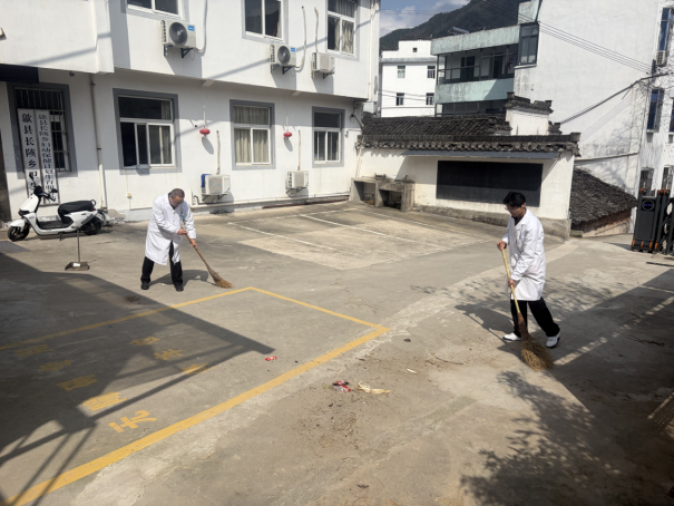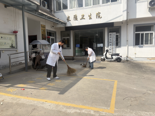 在院内,身着白大褂的医护人员手持扫帚等清洁工具,对院区地面、公共区域进行全面清扫。大家分工协作,仔细清扫地面上的杂物、落叶及生活垃圾,不放过任何卫生死角。清扫过后,院区整洁清爽,给前来看病的群众营造了更舒心的就医环境。