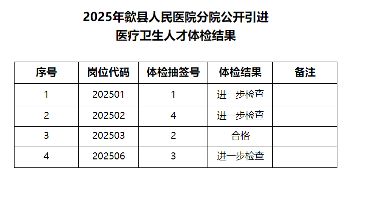 据《歙县人民医院2025年公开引进医疗卫生人才公告》规定,现将4月17日体检结果(见附件)及相关事项公告如下: