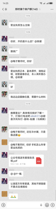 “营业执照注销要带啥材料?”“店面换地址咋变更?”“手机上年审咋操作?”……在郑村镇个体户交流群里,商户们的咨询消息接连弹出,有时并不在工作时间,却总能第一时间得到回应。