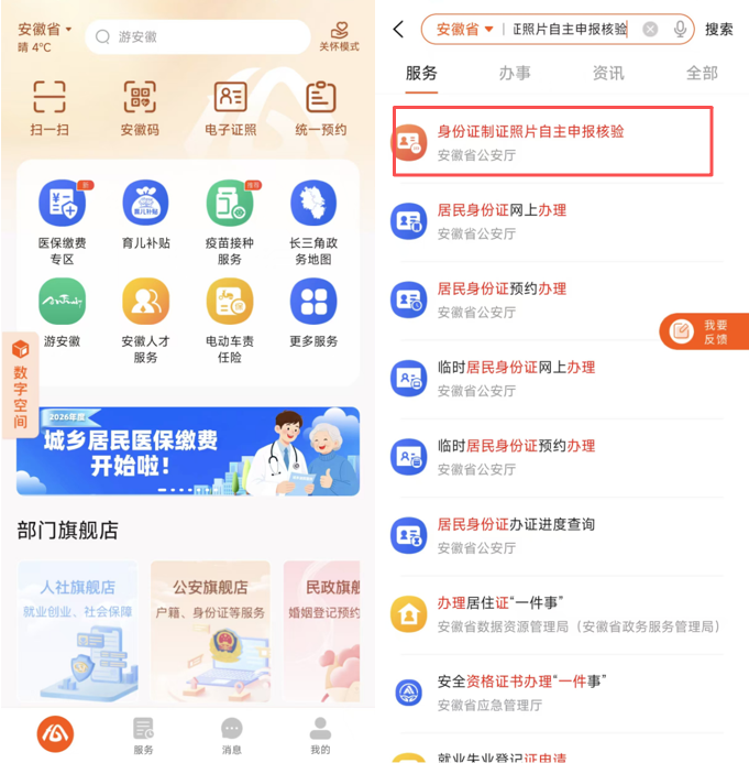 1.打开“皖事通”APP,在搜索框搜索“身份证制证照片自主申报核验”,点击进入。
