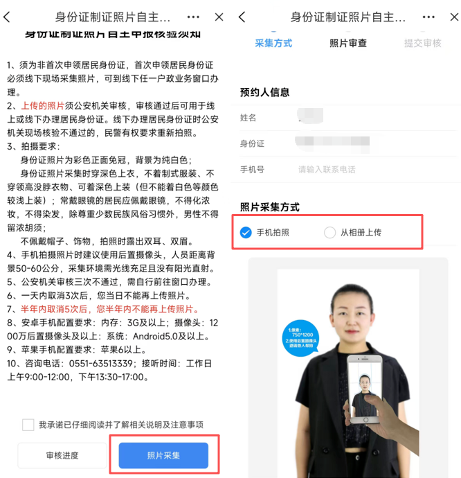 2.认真阅读办理须知后,点击“照片采集”,选择照片采集方式,提交符合要求的照片,按操作提示完成照片提交审核。