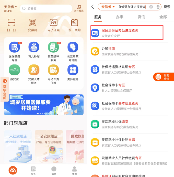 办证提交审核后,在首页搜索“居民身份证办证进度查询”,可查询本人或他人身份证办理进度。