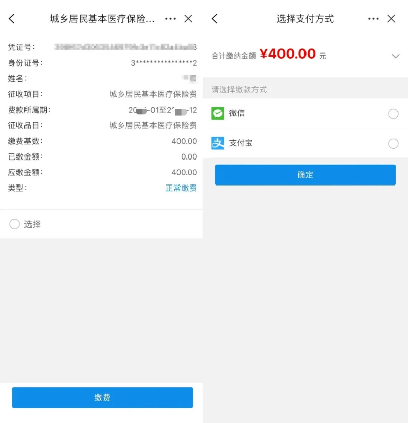 3.在服务页面输入参保人的身份证号后点击“下一步”,确认参保人信息,在支付渠道选择“医保个人账户共济”,最后点击“立即缴费”即可。