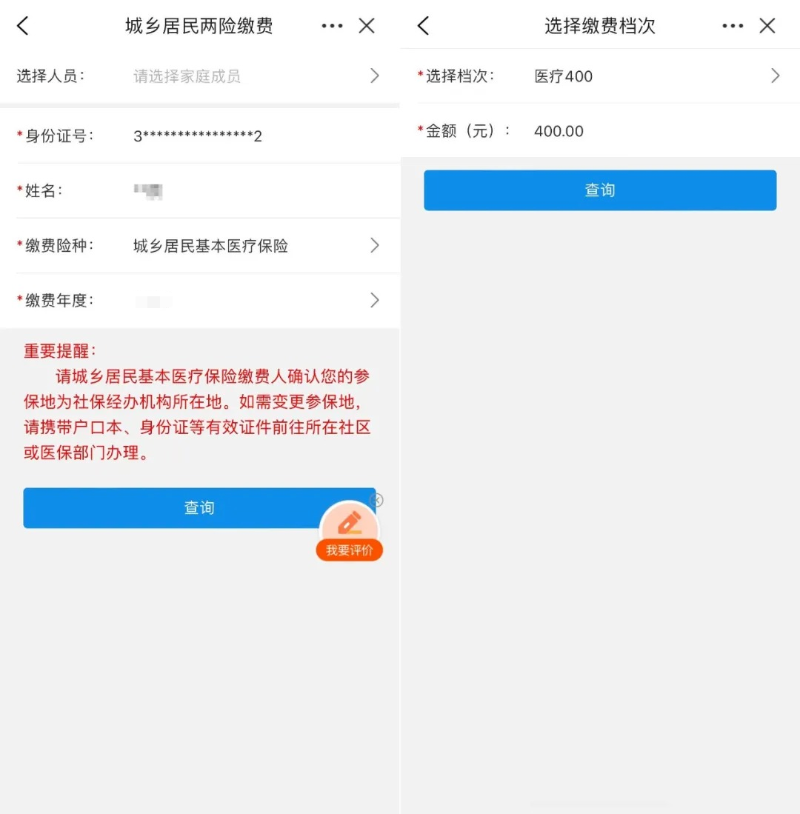 3.选择本次缴费的参保人以及缴费险种和缴费年度后,点击“查询”。
