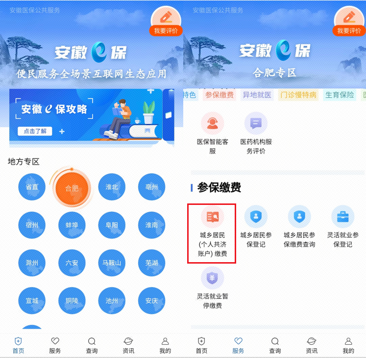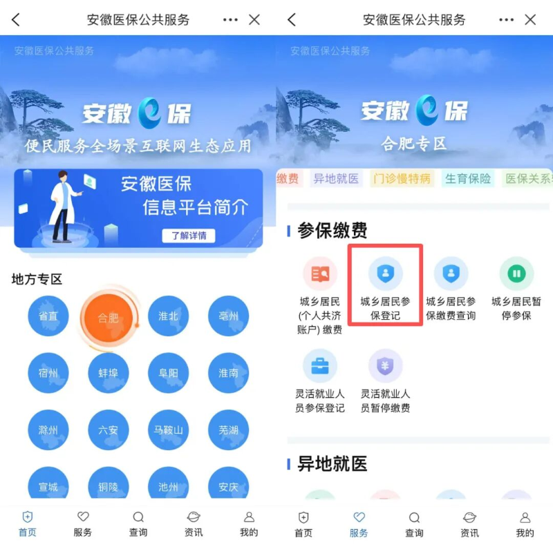 2.选择你所在的区域,这里以“合肥”为例,在“服务”页面找到“参保缴费”版块,选择“城乡居民参保登记”服务。