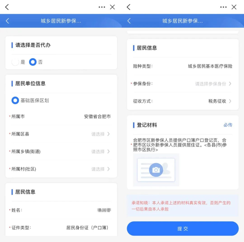 3.在“居民参保登记”界面,根据自身情况填写相关信息后,点击“提交”即可。