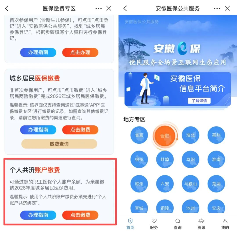 2.进入安徽医保公共服务平台,选择你所在的区域,这里以“合肥”为例,在“服务”页面找到“参保缴费”版块,选择“城乡居民(个人共济)缴费”服务。
