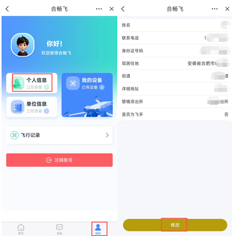 4.在“我的”页面,可查看个人信息、设备情况以及飞行记录等。这里以“个人信息”为例,点击进入可查看具体信息;如信息需更新,点击“修改”后完成信息更新即可。