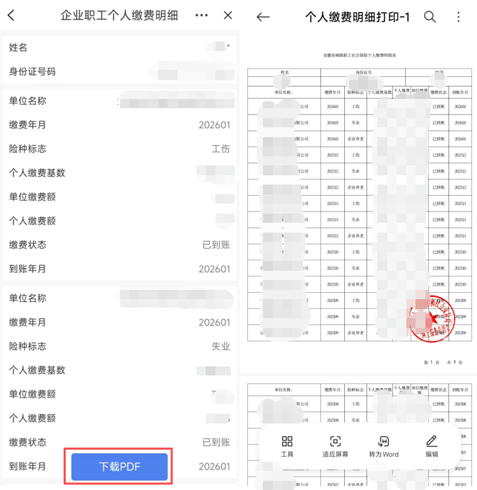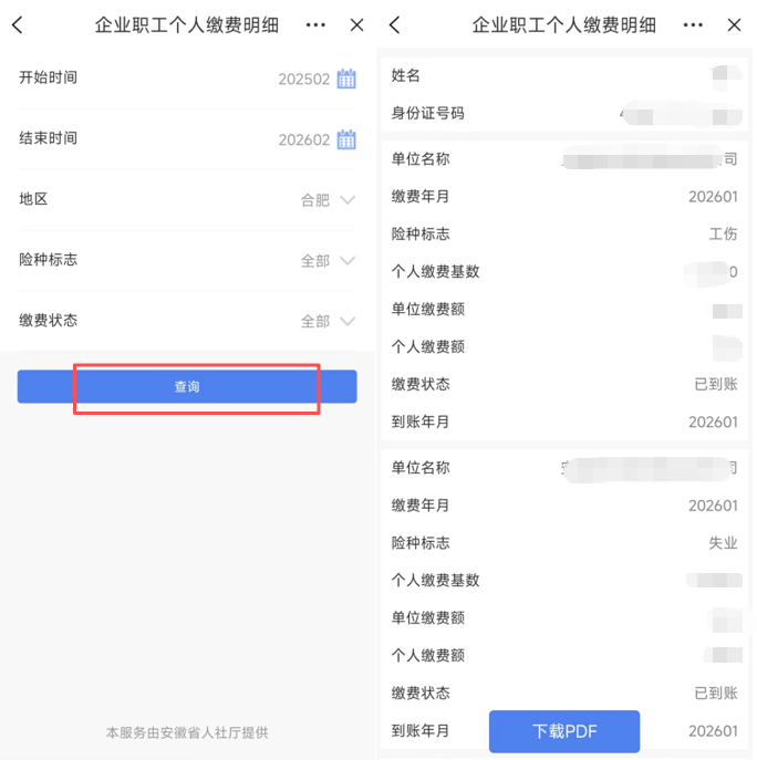 在查询页面,可以点击“下载PDF”,按提示操作即可下载“个人缴费明细”PDF版。