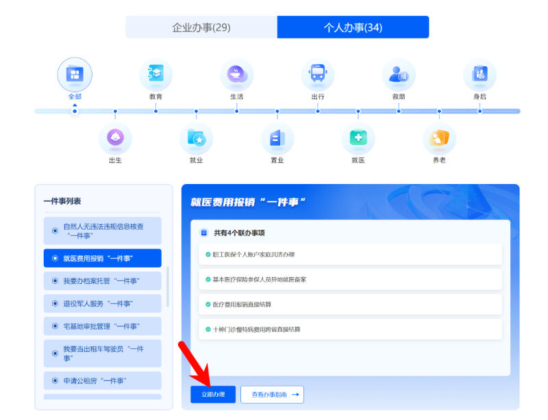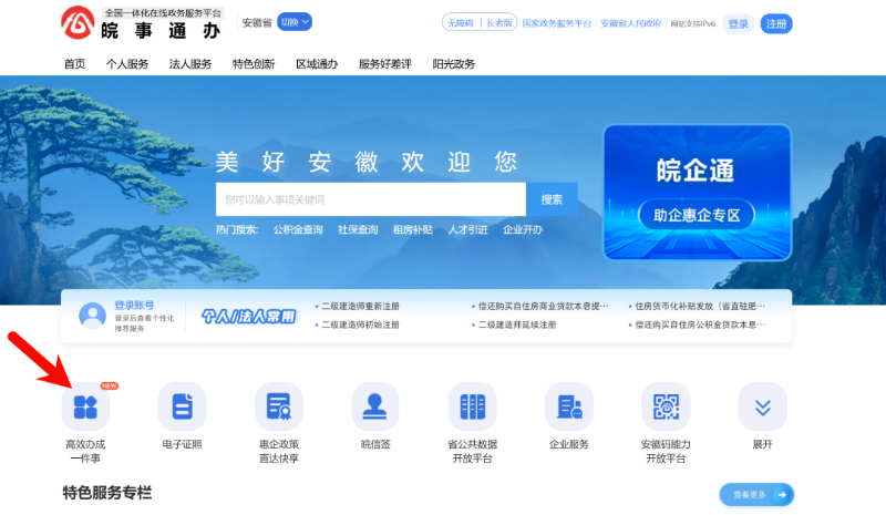 1、打开“皖事通”APP,在搜索框搜索“高效办成一件事”,找到“就医费用报销一件事”,点击进入。阅读办理详情页后,点击【在线办理】按钮进入“用户须知”“情形引导”页面。