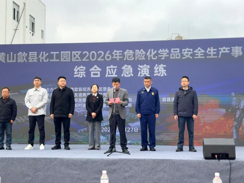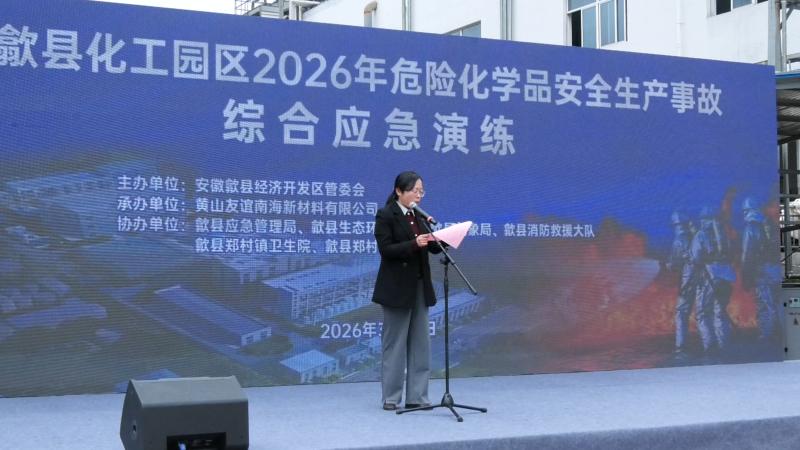为切实提升危险化学品安全生产事故应急救援能力,增强化工园区应对安全生产事故和突发事件的处置水平,3月27日上午,歙县化工园区联合黄山友谊南海新材料有限公司开展危险化学品生产安全事故综合应急演练。副县长潘慧群,县经开区管委会副主任江志伟、县经开区管委会有关部门负责同志及化工园区企业负责人、安环人员等80余人现场观摩。