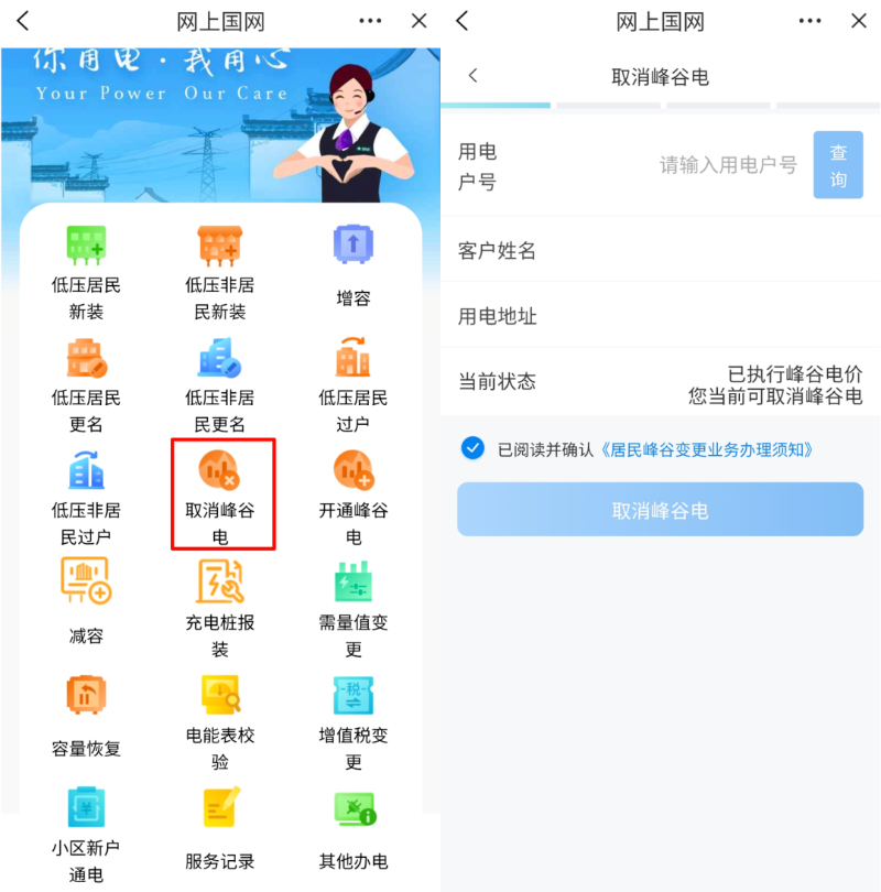 在国家电网服务页面找到“取消峰谷电”服务,点击进入。查看办理业务需要准备的材料,填写相关信息后,点击“取消峰谷电”即可。