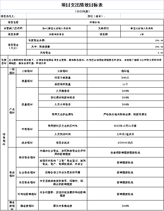【总体目标】 在上级财政统筹安排下,合理有效使用各项支出费用,做到账实相符。杜绝资金违规使用等情况的发生,有效推广新溪口乡村财乡管财务管理制度,做到有章可循,照章办事 【产出指标-数量指标】 指标1:基层组织数量(11个) 指标2:村组干部数量(≥60人) 【产出指标-质量指标】 指标1:费用支出的合规性(严格执行相关财经法规、制度等规定) 指标2:人员满勤率(≥95%) 指标3:单位规章制度知晓率(≥95%) 指标4:人员办事效率(≥95%) 【产出指标-时效指标】 指标1:费用拨付及支出的及时性(2023年12月31日前) 指标2:人员到岗时间(工作日/值班日) 【产出指标-成本指标】 指标1:项目总成本(≤2444438元) 【效益指标-经济效益指标】 指标1:对撬动社会资金、发挥财政资金杠杆作用的影响程度(改善或影响程度程度较高) 指标2:加强农村集体“三资”资金登记,做到资金、资产、资源底数清、内容全(影响程度较高) 【效益指标-社会效益指标】 指标1:保障各项工作业务更好的开展(影响程度较高) 【效益指标-生态效益指标】 指标1:对党委政府政策的宣贯,保障村、组、群众的影响程度(影响程度较高) 【效益指标-可持续影响指标】 指标1:对各村履职、促进村级发展的持续影响程度(影响程度较高) 【满意度指标-服务对象满意度指标】 指标1:服务对象满意度(≥95%) |