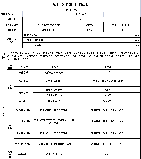 2.“文明创建”项目。 (1)项目概述。主要用于文明创建、创城创卫及环境整治所产生的相关费用。 (2)立项依据。根据财政体制,乡镇基本费用5万元每年,加上辖区总人口5元/人计算。 (3)起止时间。2023年1月1日-2023年12月31日。 (4)项目内容。按照“生产发展、生活宽裕、乡风文明、村容整洁”的标准,推进我镇的精神文明建设和乡村振兴的系统、全面、深入、扎实的开展。争创文明县城,为我县的创城创卫添砖加瓦。 (5)年度预算安排。11.96万元 (6)绩效目标和指标。按照“生产发展、生活宽裕、乡风文明、村容整洁”的标准,推进我乡的精神文明建设和乡村振兴的系统、全面、深入、扎实的开展。争创文明县城,为我县的创城创卫添砖加瓦。预计开展创城创卫专题宣传活动2次,每月进行专项的文明创建环境整治检查。结合主题党日活动开展乡村振兴活动1次。做到时时有变化,刻刻更文明。年底前完成文明乡镇创建工作。文明乡镇的创建结合本乡旅游品牌的打造,吸引更多的游客,带动经济效益,促进农民增收。通过文明创建、乡村振兴,不断提高本乡的知名度和影响力。文明创建的政策效益宣传结合环境整治的方式会大大提升创建的效果。