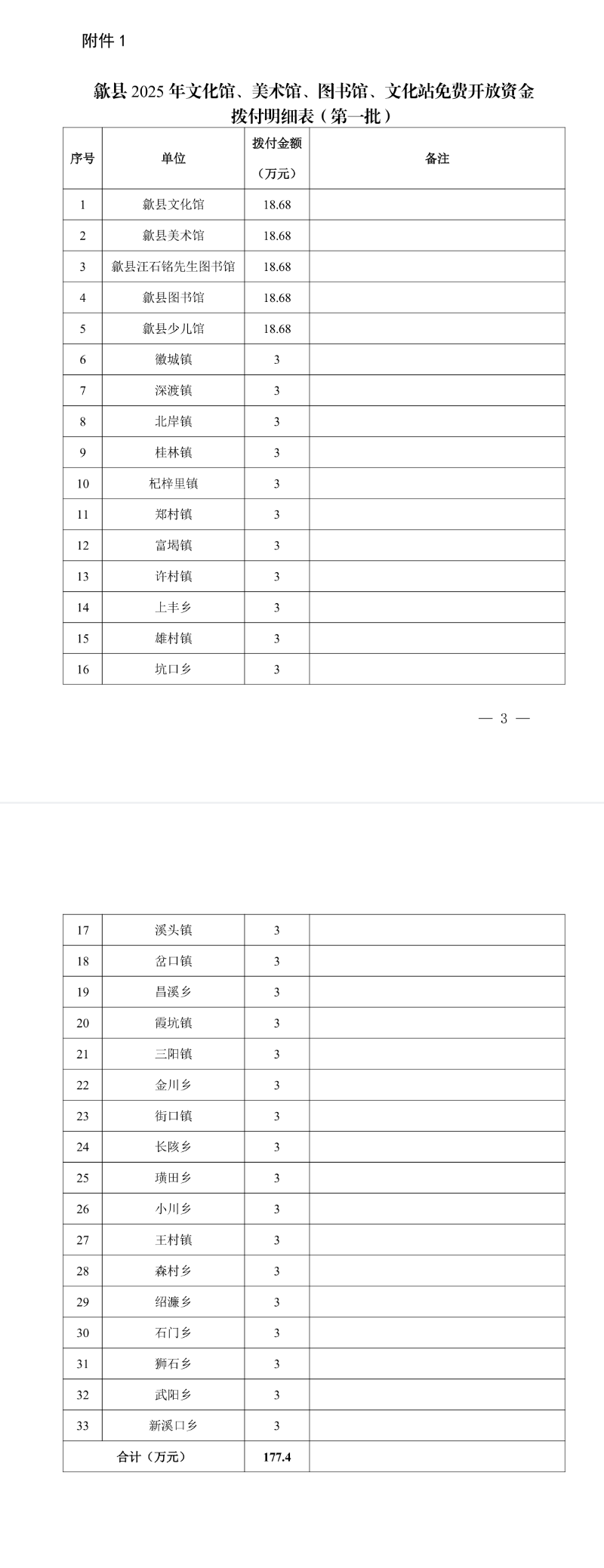 歙县 2025 年文化馆、美术馆、图书馆、文化站免费开放资金拨付明细表(第一批)