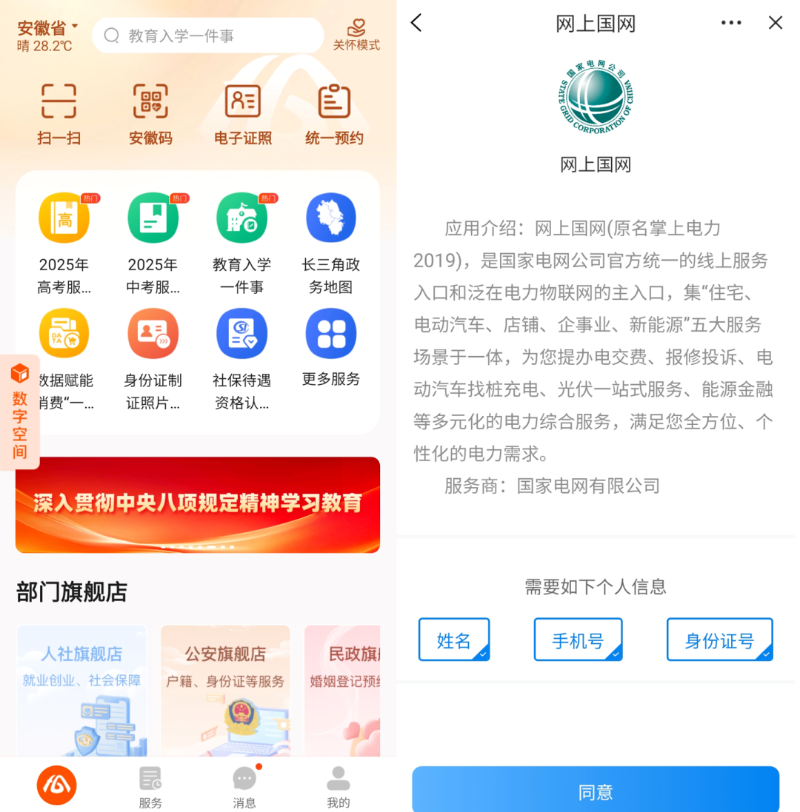 下载“皖事通”APP并注册登录,在首页搜索框中搜索“国家电网服务”,点击进入。