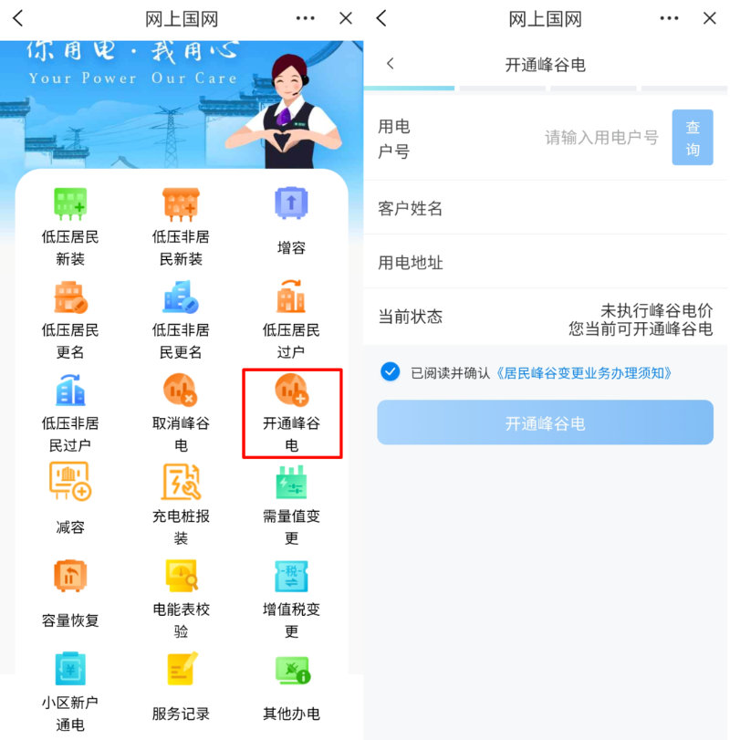 在国家电网服务页面找到“开通峰谷电”服务,点击进入。查看办理业务需要准备的材料,填写相关信息后,点击“开通峰谷电”即可。