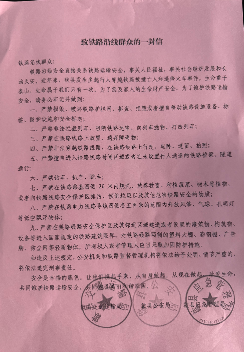 【预警信息】【交通安全类】致铁路沿线群众的一封信