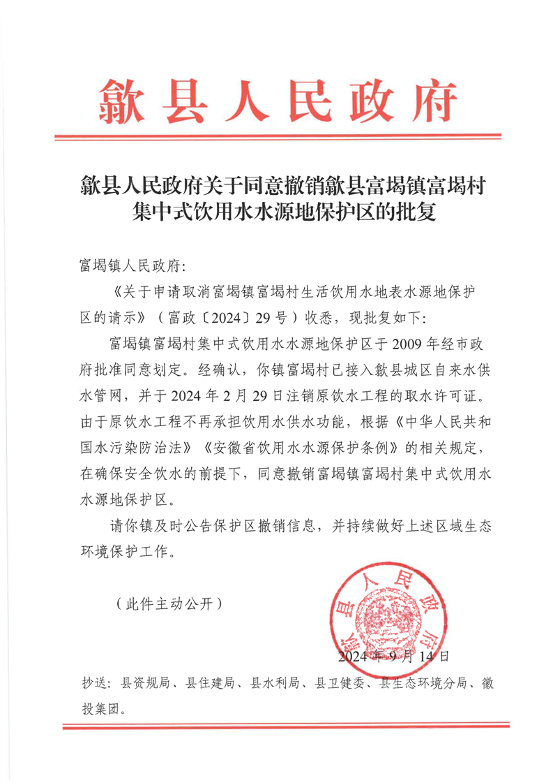 歙县人民政府关于同意撤销歙县富堨镇富堨村集中式饮用水水源地保护区的批复