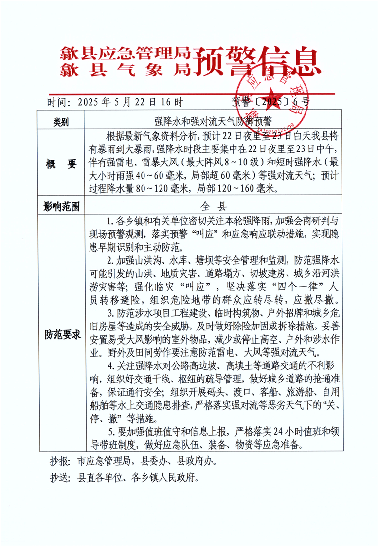 【自然灾害】预警信息6号(强降水和强对流天气防御预警)
