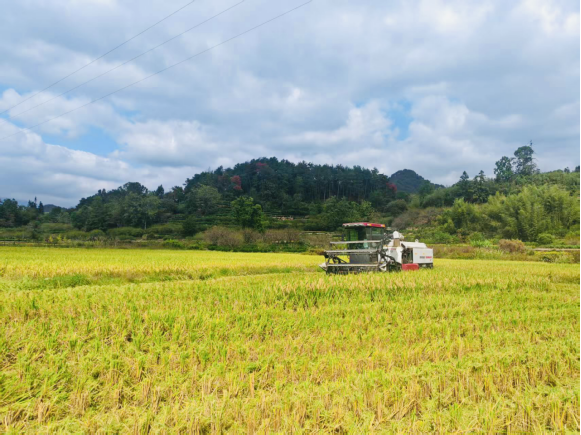 金秋时节,许村镇的千亩稻田迎来丰收季。连片的稻田里,金黄稻穗压弯了秸秆,微风拂过掀起层层“稻浪”,收割机穿梭田间,轰鸣声与农民的笑声交织,勾勒出一幅热闹的丰收画卷。