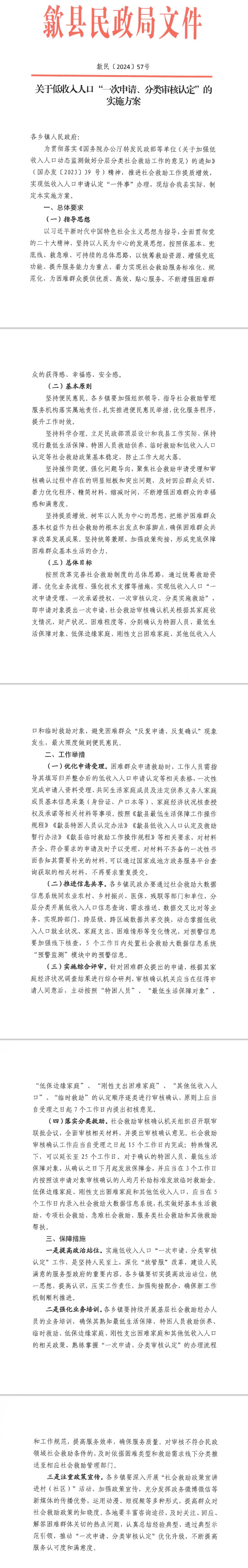 根据《关于低收入人口“一次申请、分类审核认定”的实施方案》(歙民[2024]57号文件),为推进社会救助工作提质增效,实现低收入人口申请认定“一件事”办理。结合我镇实际,经研究同意,现将该文件印发给你们,请认真贯彻落实。